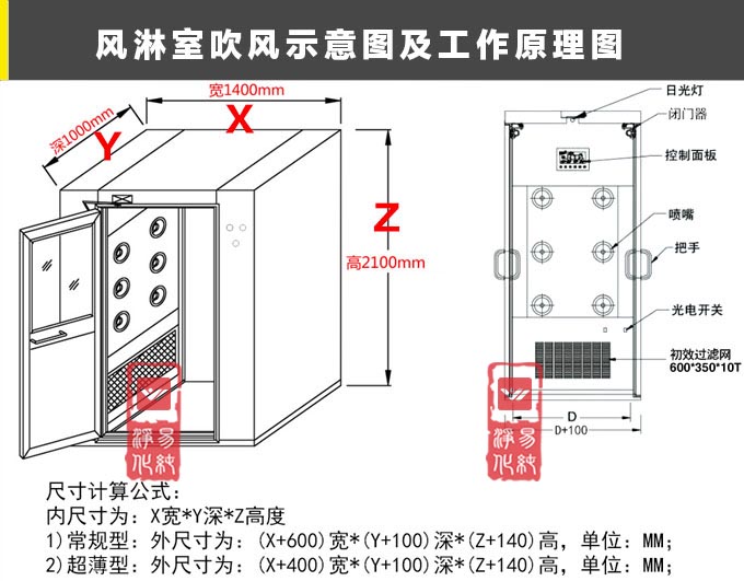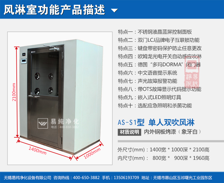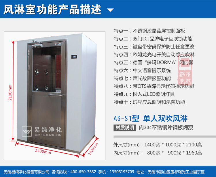 1. 外型尺寸(W*D*H):1400mm*1000mm*2100mm;風(fēng)淋區(qū)尺寸(W*D*H):800mm*900mm*1960mm