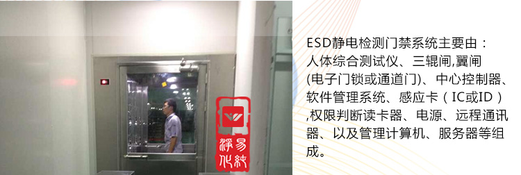 ESD靜電檢測(cè)門禁系統(tǒng)主要由:人體綜合測(cè)試儀、三輥閘,翼閘(電子門鎖或通道門)、中心控制器、軟件管理系統(tǒng)、感應(yīng)卡(IC或ID),權(quán)限判斷讀卡器、電源、遠(yuǎn)程通訊器、以及管理計(jì)算機(jī)、