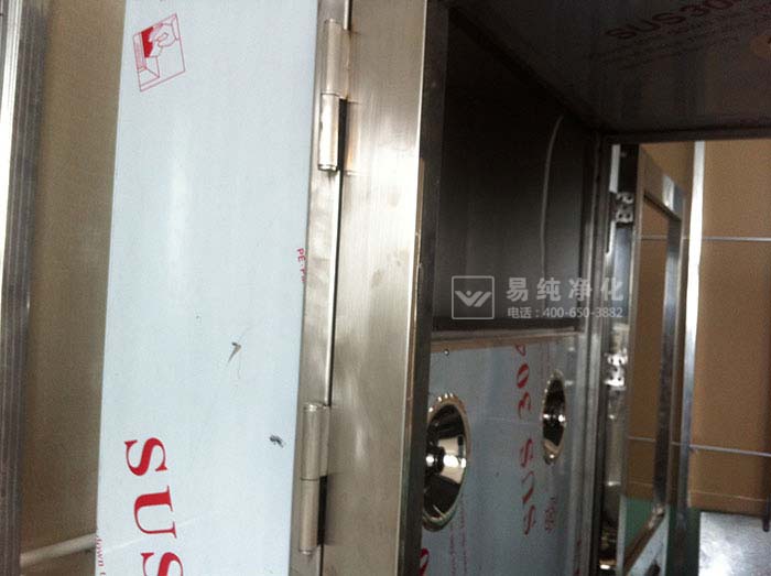 (四)整體框架完成之后,再進行門安裝,門和門框皆由不銹鋼方管及不銹鋼制作,鉸鏈采用三道不銹鋼鉸鏈加固,原門框與門板已經(jīng)由廠家出廠前已經(jīng)安裝好。此時只需要將鉸鏈固定于風淋側(cè)面廂體之可。如果門安裝好之后門框與箱體之間縫隙不齊平有摩擦,那么是因為地平不平而導(dǎo)致,此步驟并不需要調(diào)整門框,只需要對風淋下部進行垂直校正,將風淋底盤墊平即可。可反復(fù)調(diào)試四角加墊片,一旦墊平,門體將會與箱體縫隙完全整齊。