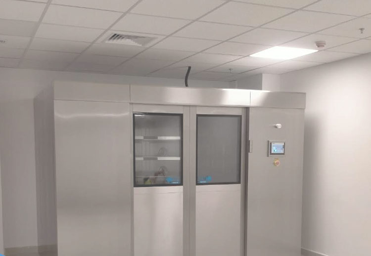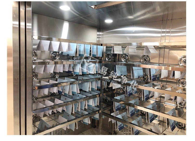 工作原理介紹:檔案消毒除塵室采用全不銹鋼材質(zhì)制作,進(jìn)門為自動(dòng)感應(yīng)雙側(cè)是移門,人員觸碰按鈕后開門,將托盤送入到除塵室內(nèi),人員退出后關(guān)閉自動(dòng)門,當(dāng)門關(guān)閉后,除塵室內(nèi)啟動(dòng)風(fēng)淋除塵,此時(shí)自動(dòng)門鎖閉,工作報(bào)警指示燈顯示為紅色狀態(tài),門無法打開。當(dāng)除塵時(shí)間到達(dá)后,報(bào)警指示燈顯示為綠色并發(fā)出報(bào)警聲音,門為可開狀態(tài)。人員取出托盤,將之送入到庫房內(nèi)進(jìn)行保存。